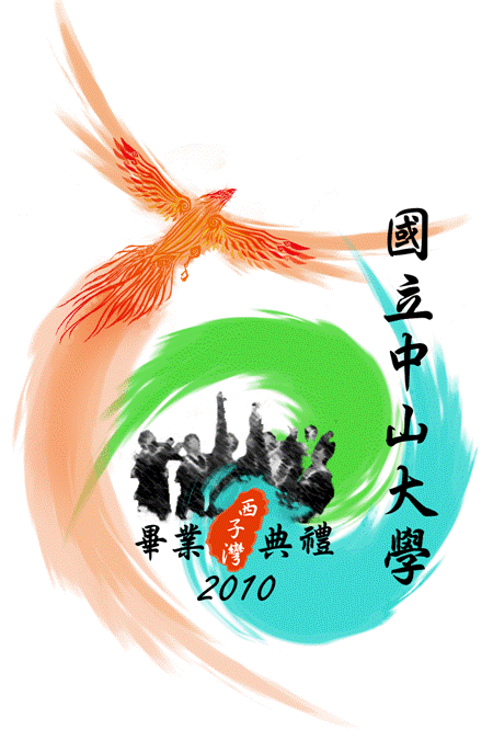 中山大學背山面海,擁有獨一無二的校園自然景觀。因此我用藍色與綠色的潑墨分別代表中山大學的柴山與西子灣的海岸,以凸顯學校的特色。此外,未了表達出畢業的感覺,我在LOGO的中央放了一個畢業生拋學士帽的圖案,下方紅色的墨塊寫著西子灣,因為紅色就是中山大學建築物的顏色。左上方飛翔的鳳凰除了祝福畢業生鵬程萬里之外,還象徵著中山大學的畢業生正要從校園起飛,朝向更遠大的目標前進。